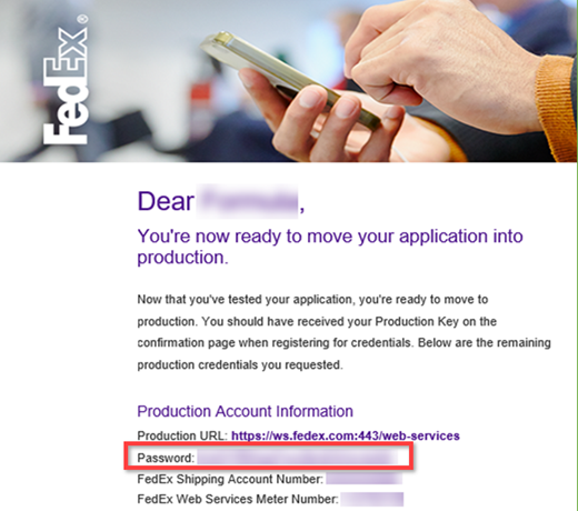 Authentication Key from the confirmation screen, make up the four credentials that will be used in each transaction submitted to FedEx.